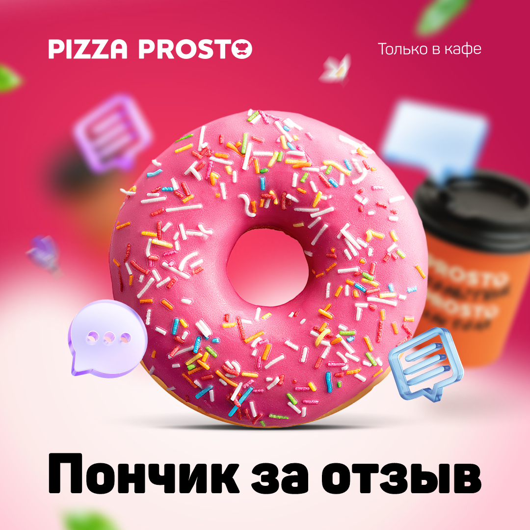 - Напиши своё мнение о Pizza Prosto в Справочнике VL.ru, Яндекс (карта) или 2GIS и получи пончик в подарок.
